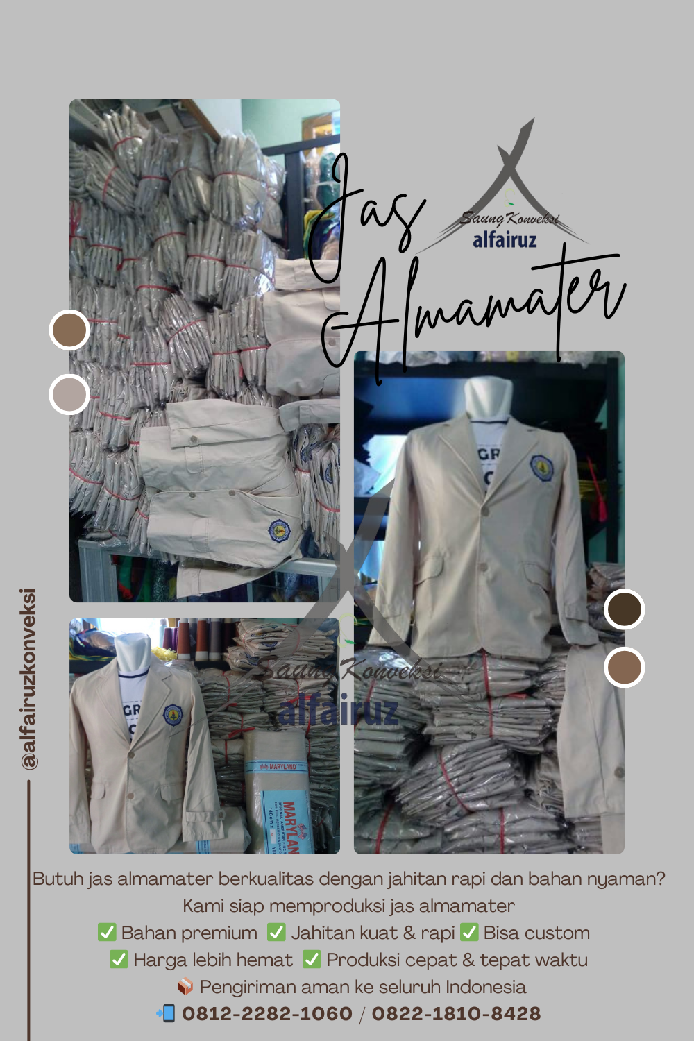 Saat mencari konveksi jas almamater murah, jangan sampai asal memutuskan Jas almamater bukan semata-mata seragam, melainkan tanda pengenal resmi institusi Dengan alasan tersebut, bahan berkualitas, jahitan rapi, dan desain presisi harus diprioritaskan Kini, berbagai institusi pendidikan dan organisasi mencari konveksi jas almamater dengan hasil terbaik tanpa mengesampingkan mutu Tempat produksi almamater berkualitas umumnya memiliki tahapan kerja yang jelas dan terarah Selain itu, para penjahit berpengalaman memastikan setiap unsur dikerjakan secara teliti Oleh karena itu, produk akhir terlihat tertata, elegan, serta nyaman digunakan pada kegiatan resmi